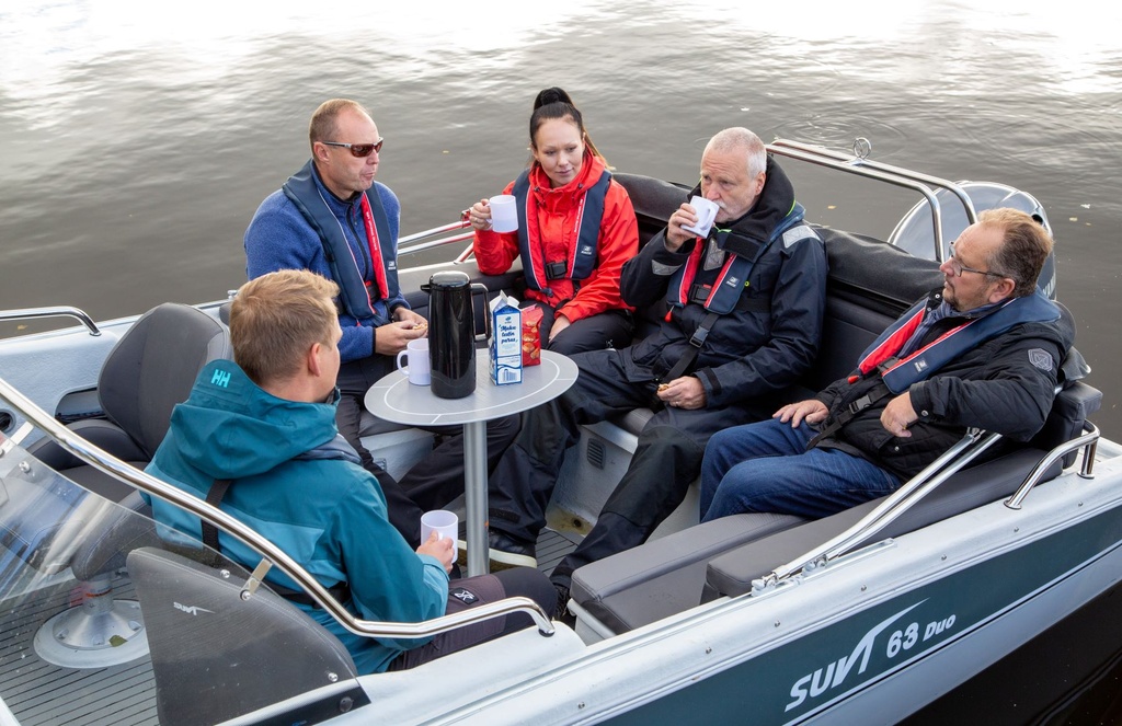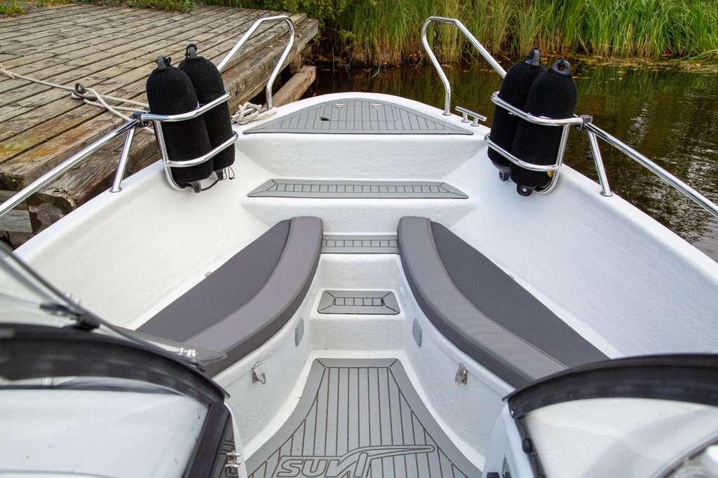 Uutuus 2022! Suvi 63 Duo on reilulla takatilalla ja hyvillä vakiovarusteilla varustettu malli mökki- ja yhteysveneeksi saaristoon ja suuremmille järville. Takapenkki ja sivupenkit muodostavat U-mallisen sohvan, joka uusine selkänojineen sopii hyvin evästaukojen pitämiseen tai muuhun oleskeluun. Lisävarusteena on saatavana uusi suurempi irrotettava pöytä. Myös sivupenkkien alla on lukittavat säilytystilat.