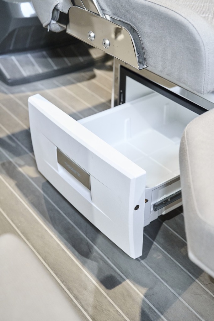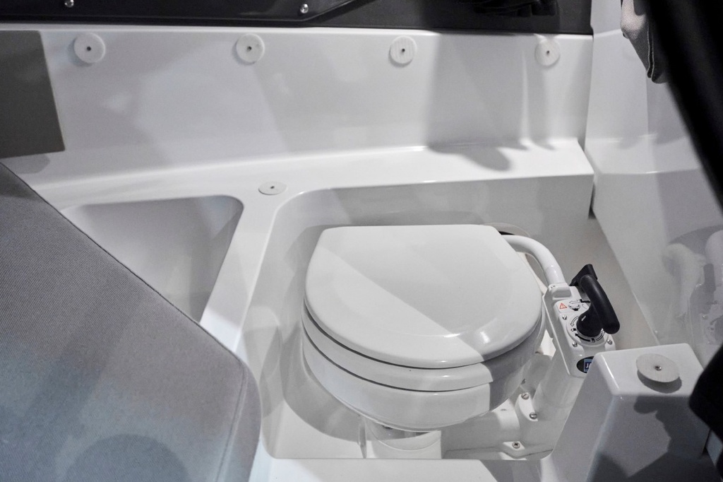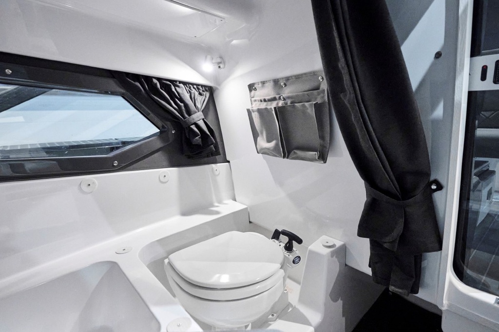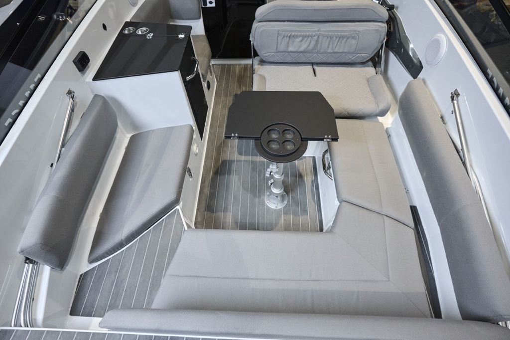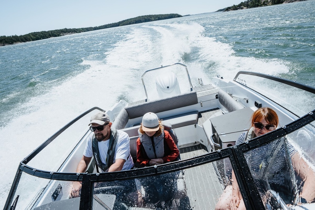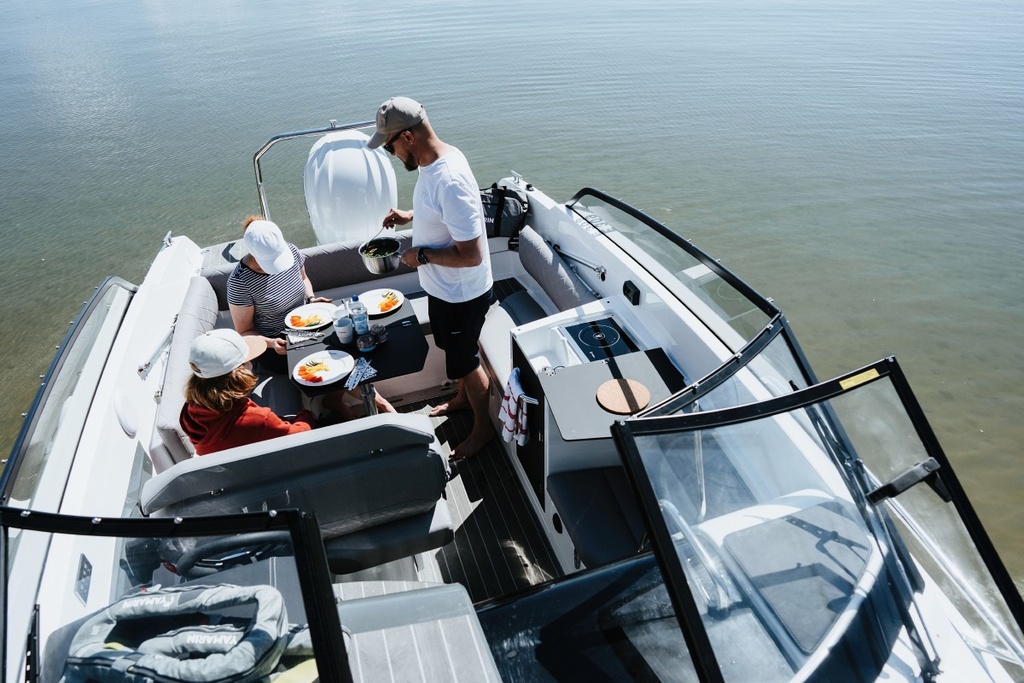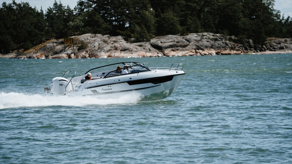 Leveän vesilinjan ansiosta vene on vakaa ja kulku tasaista. 250 hp:n moottorilla vauhti nousee jopa 46 solmuun.