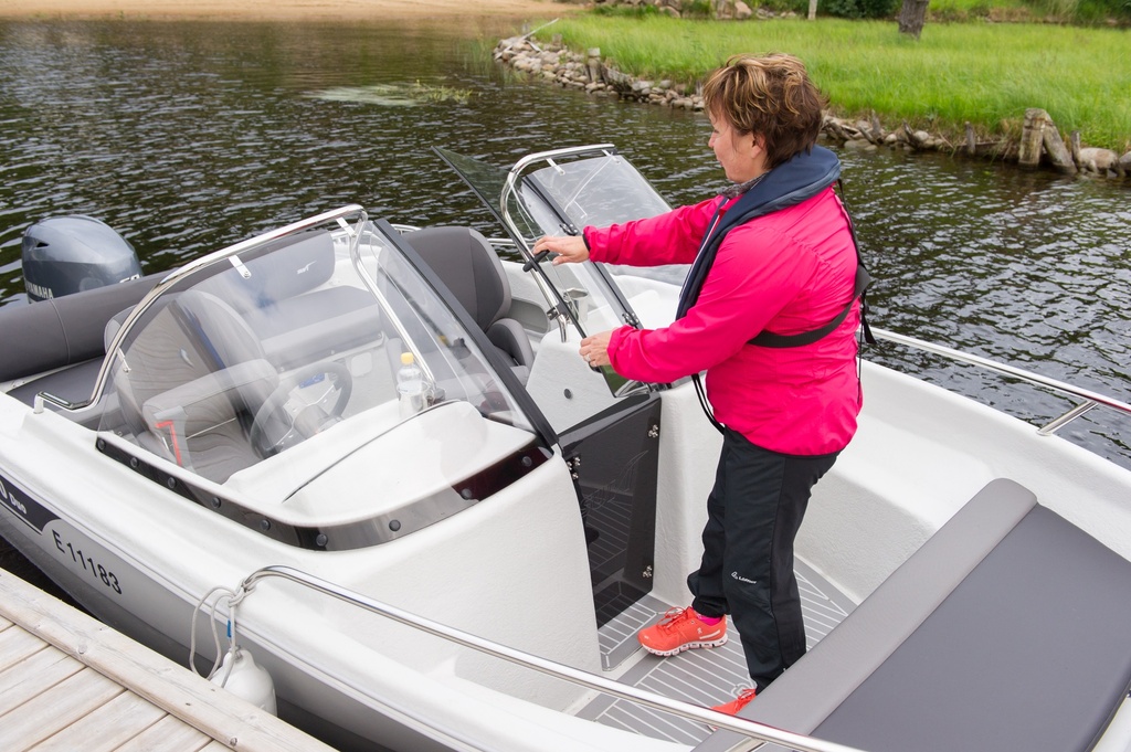Mycket populär förbindelse- och fiskebåt med dubbelpulpet. Utmärkta köregenskaper. Bred modell med mycket god sidostabilitet. Båten är utrustad med väl skyddande vindrutor, rikligt med räcken, 2 st. låsbara stuvutrymmen. Rejält tilltagna stuvutrymmen för t.ex. kylväska eller kassar under styrpulpeterna. Rekommenderad motoreffekt max. 60 hk. Utrustad med regnläns. Nytt, tvådelat kapell för akterhytten finns att få som extrautrustning.