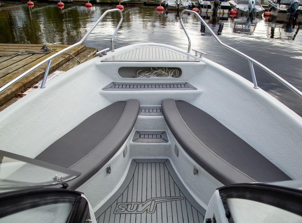 Suvi 63 Duo Fisher är en dubbelpulpetbåt designad för fiske. Kapell fås som tilläggsutrustning. Kapelldelarna - fram, bak och mellanvägg, kan skaffas separat. Fishern har samma utmärkta skrov och köregenskaper som 63 Duo. De löstagbara delarna i bakbänken ger ännu mer utrymme ombord och gör det lättare att röra sig i samband med fiske. Två långa stuvutrymmen exempelvis för spön. Framdäcket är utan lucka och det är lätt att sätt till en extramotor i fören. Självlänsande.